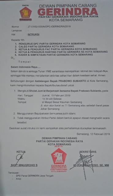 Beredar Surat Intruksi dari DPC Gerindra Kota Semarang untuk Shalat Jumat Bersama Prabowo Subianto