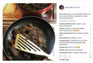 “When you travel 2900 miles from home, and still have rendang for dinner. #travelingwithmom,” ungkap Ariel NOAH, Rabu (20/2/2019).