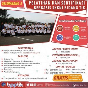 BPPTIK Buka Pendaftaran Pelatihan & Sertifikasi Kompetensi Bidang TIK Berbasis SKKNI Gelombang ke-5 tahun 2019. Istimewa