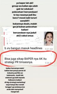 “Ya baperlah aki (Yan Widjaya), grup WA kalian saja sudah gak teredukasi!, Pelecehan! Bercandaan! Lo tau rasanya jadi ibu baru? Mood naik turun! Sensitif! Bukannya doain malah gue jadi bahan pelecehan kalian. Becandaannya jadul! Aki-aki cabul semua,” tulis Aura Kasih kesal membaca dirinya masih jadi bahan becanda kotor di grup WA.