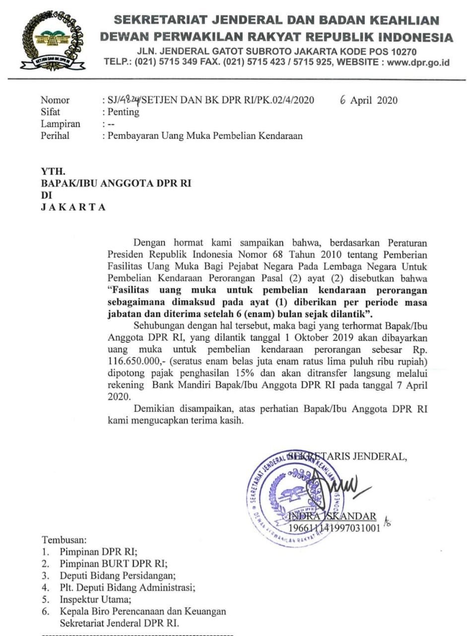 Pasalnya, surat itu berisikan aturan pembayaran uang muka pembelian kendaraan bagi anggota DPR RI sebesar Rp 116.650.000.