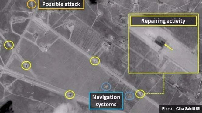 Dalam gambar itu, terlihat kondisi Bandara Shayrat di Provinsi Homs, Suriah yang hancur akibat serangan bom-bom yang dilepaskan militer Israel dari pesawat tempur.