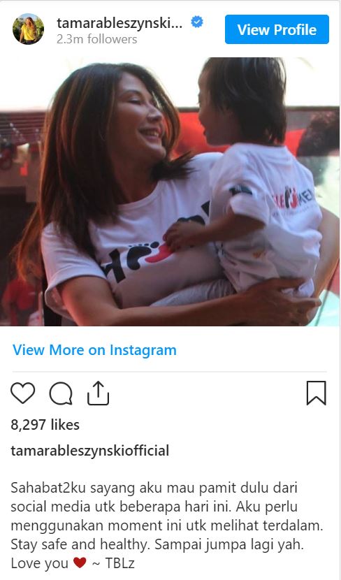 “Sahabat2ku sayang aku mau pamit dulu dari social media utk beberapa hari ini,” tulis Tamara Bleszynski di keterangan fotonya, Jumat, 10 April 2020.