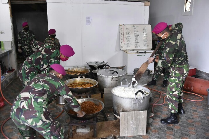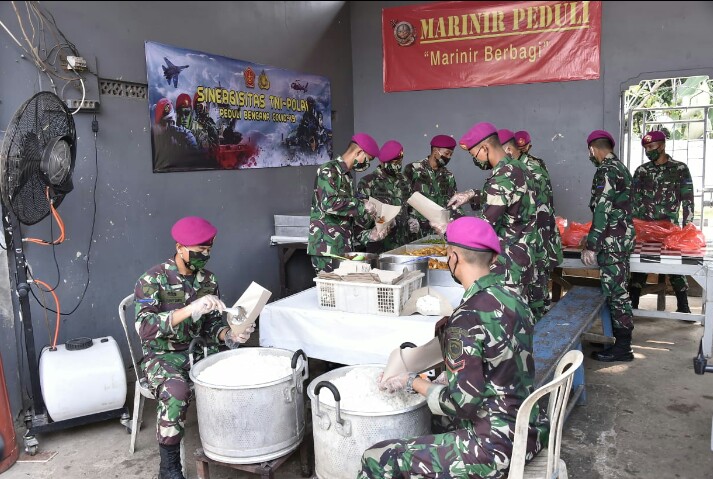 Dapur Umum TNI-Polri yang dipusatkan di Yonbekpal 1/Marinir, Mako Marinir Cilandak, Jakarta Selatan, setiap harinya mendistribusikan seribu lebih nasi bungkus untuk membantu warga yang terkena dampak Virus Corona atau Covid-19 dan Pembatasan Sosial Berskala Besar (PSBB).