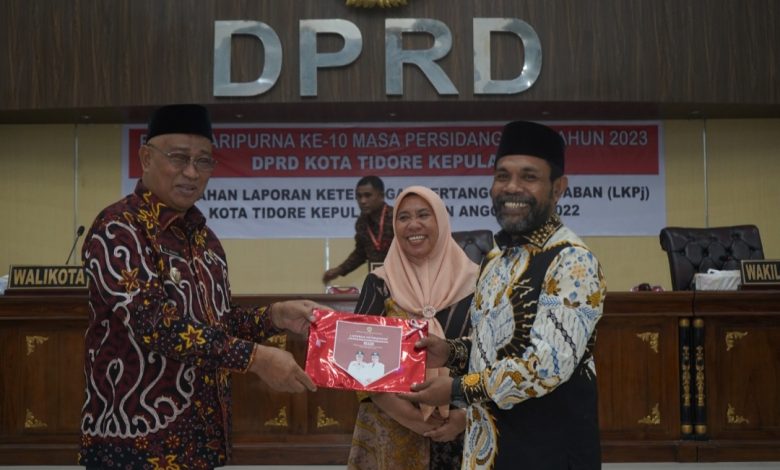 Diakhir Rapat Paripurna, Walikota Tidore Kepulauan Capt, H. Ali Ibrahim menyerahkan Laporan Keterangan Pertanggungjawaban Pemerintah Daerah Kota Tidore Kepulauan Tahun 2022 Kepada Plt. Ketua DPRD Kota Tidore Kepulauan.