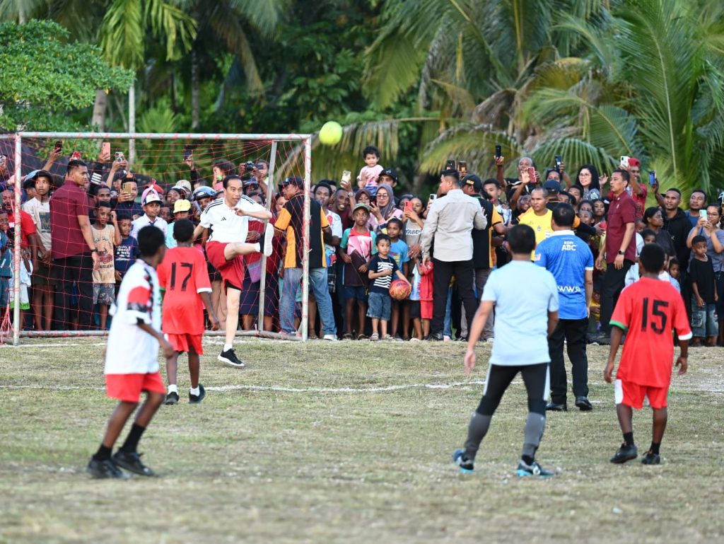 Presiden Jokowi yang mengenakan kaus berwarna putih dengan nomor punggung 23 tampak antusias bermain sepak bola bersama para pelajar. Semangat yang sama juga ditunjukkan oleh para pelajar yang berasal dari sejumlah sekolah di Kabupaten Biak Numfor saat berusaha menggiring bola dan mencetak gol.
