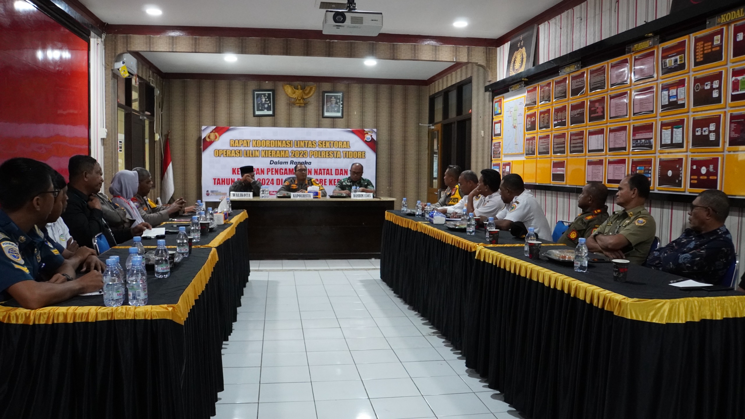 Abadikini.com, TIDORE – Dalam rangka pelaksanaan Pengamanan Natal dan Tahun Baru 2024, Kepolisian Resort Kota Tidore Kepulauan menggelar Rapat Koordinasi (Rakor) Lintas Sektor yang dipimpin oleh Kapolresta Tidore, Kombes (Pol) Yury Nurhidayat di Ruang Rapat Polresta Tidore, Rabu (20/12/2023).