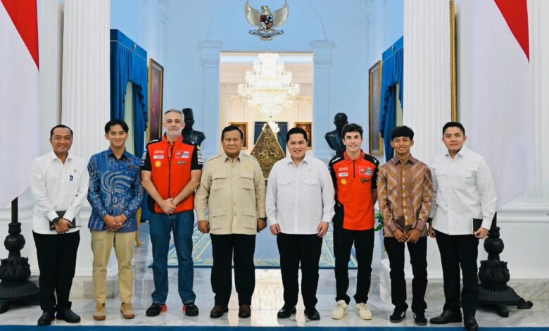 Abadikini.com, JAKARTA – Presiden Prabowo Subianto menerima kunjungan Juara Dunia MotoGP 7 kali, Marc Marquez, di Istana Merdeka Jakarta pada sore hari ini. Kunjungan yang berlangsung hampir 1,5 jam tersebut turut dihadiri oleh dua pembalap muda berbakat Indonesia, Mario Aji (21 tahun, Moto2) dan Veda Ega Pratama (16 tahun, Moto3).