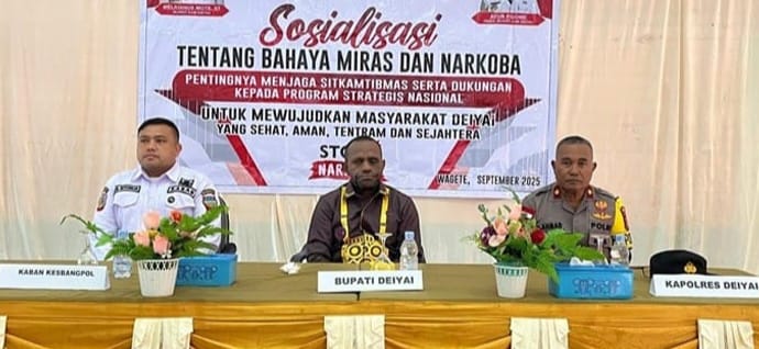 Ajakan tegas ini disampaikan Bupati Mote dalam sambutannya pada kegiatan sosialisasi bahaya Miras dan Narkoba yang diselenggarakan oleh Kesbangpol Deiyai, bertempat di Aula Sekwan, Tigido, Waghete, Sabtu (27/9/2025).