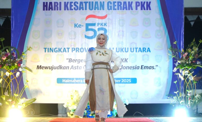 Abadikini.com, TIDORE – Malam peragaan busana Hari Kesatuan Gerak (HKG) PKK ke-53 Tahun 2025 di Lapangan Sasadu Lamo, Jailolo, Halmahera Barat, Senin (13/10/2025) malam, menjadi panggung bagi Ketua I Tim Penggerak PKK Kota Tidore Kepulauan, Ny. Sumiyati Ahmad Laiman. Ia tampil sukses memukau dengan balutan Wastra Khas Tidore, Kain Tenun Puta Dino Khayangan.