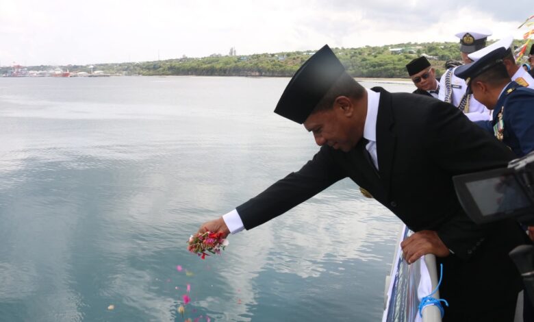 Wakil Gubernur NTT, Johni Asadoma, mendapat kehormatan menjadi Inspektur Upacara dalam prosesi yang berlangsung khidmat, diawali dengan Mengheningkan Cipta, Pelarungan Karangan Bunga, dan Tabur Bunga di laut sebagai bentuk penghormatan tertinggi kepada jasa para pahlawan yang telah gugur.
