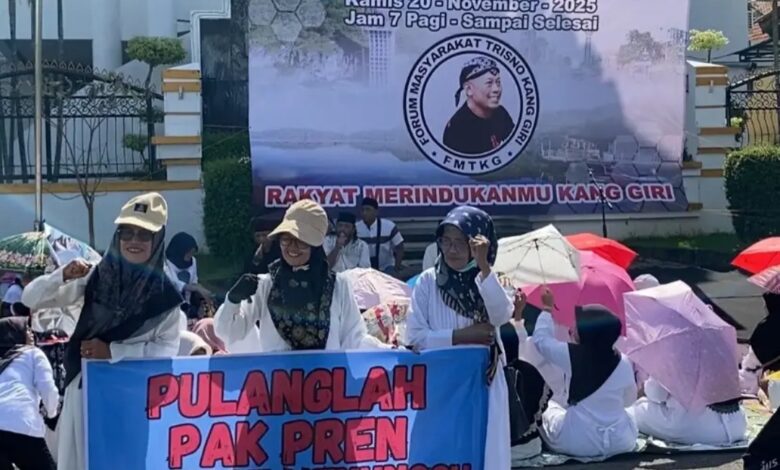 Abadikini.com, PONOROGO – Forum Masyarakat Trisno Kang Giri kembali turun ke jalan, Kamis (20/11/2025) pagi, menggelar aksi protes di depan Gedung DPRD Ponorogo. Sejumlah poster diangkat tinggi-tinggi, sebagian besar berisi tuntutan agar Komisi Pemberantasan Korupsi (KPK) memulangkan Bupati Ponorogo nonaktif Sugiri Sancoko yang terjerat operasi tangkap tangan (OTT) pada 7 November lalu.