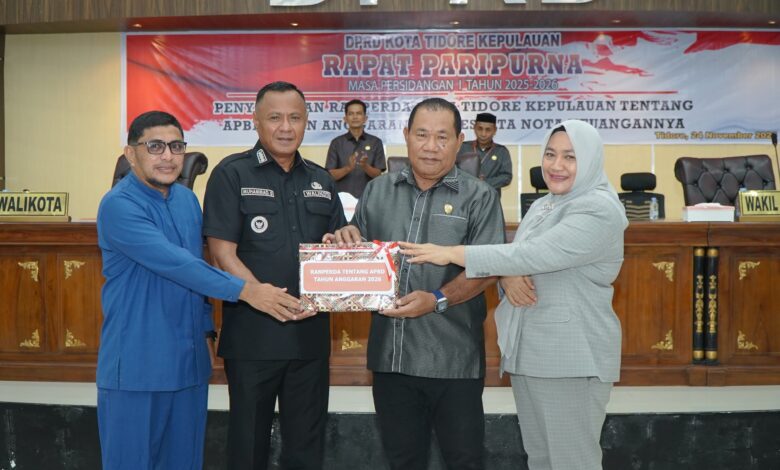 Rapat paripurna yang dipimpin Ketua DPRD Kota Tidore Kepulauan, Ade Kama, ini diakhiri dengan penyerahan dokumen Ranperda APBD Kota Tidore Kepulauan Tahun 2026 oleh Wali Kota kepada Ketua DPRD Kota Tidore.